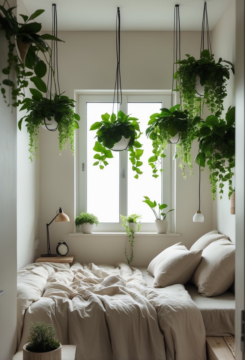 Hanging plants bring natural texture and a sense of freshness to small bedrooms. They use vertical space, which keeps the room feeling open and less cluttered.