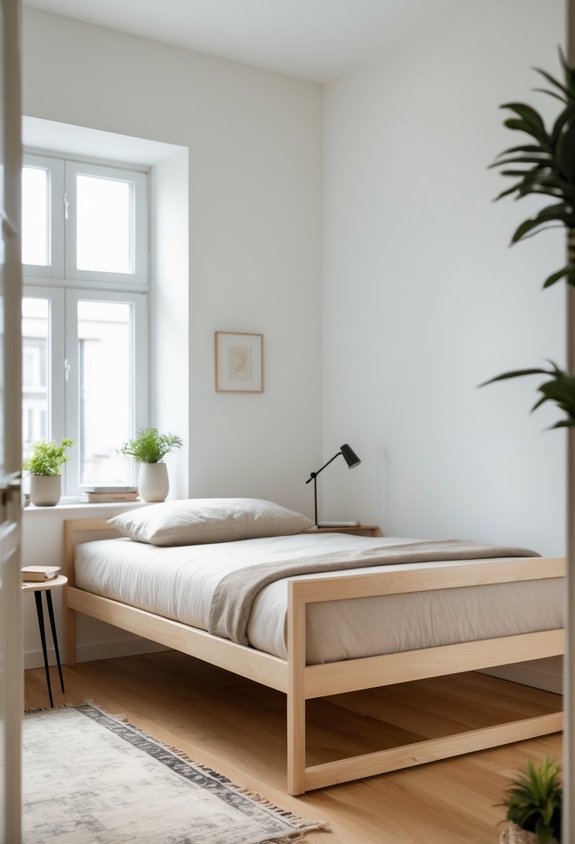A minimalist bed frame helps keep a small bedroom feeling open and uncluttered. Frames with clean lines and no bulky details create a simple, calm look.