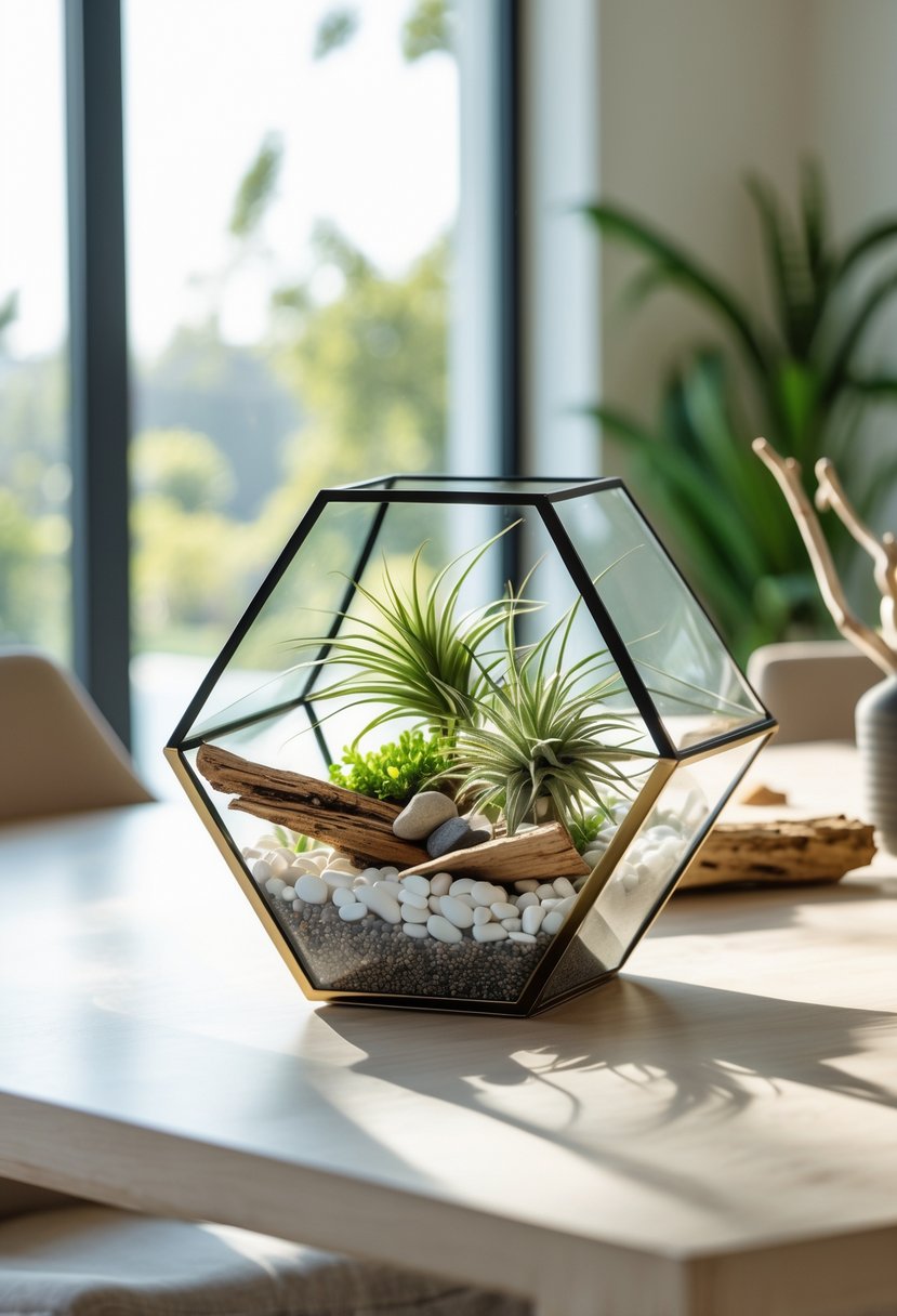 Geometric terrariums create a clean, modern look for a dining room table. They often use glass shapes like pyramids or cubes to hold air plants.