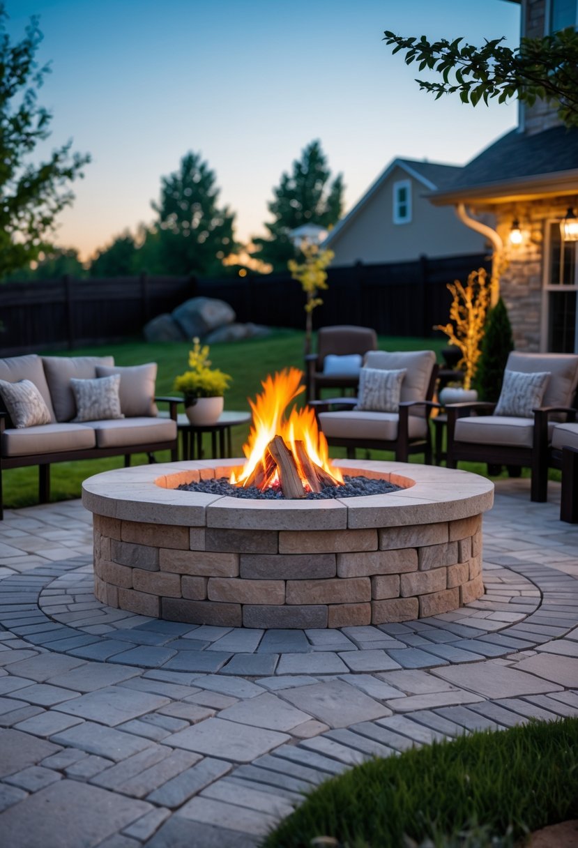 A built-in firepit with a paver surround offers a clean and sturdy look. Pavers create a defined edge that helps contain the fire safely.