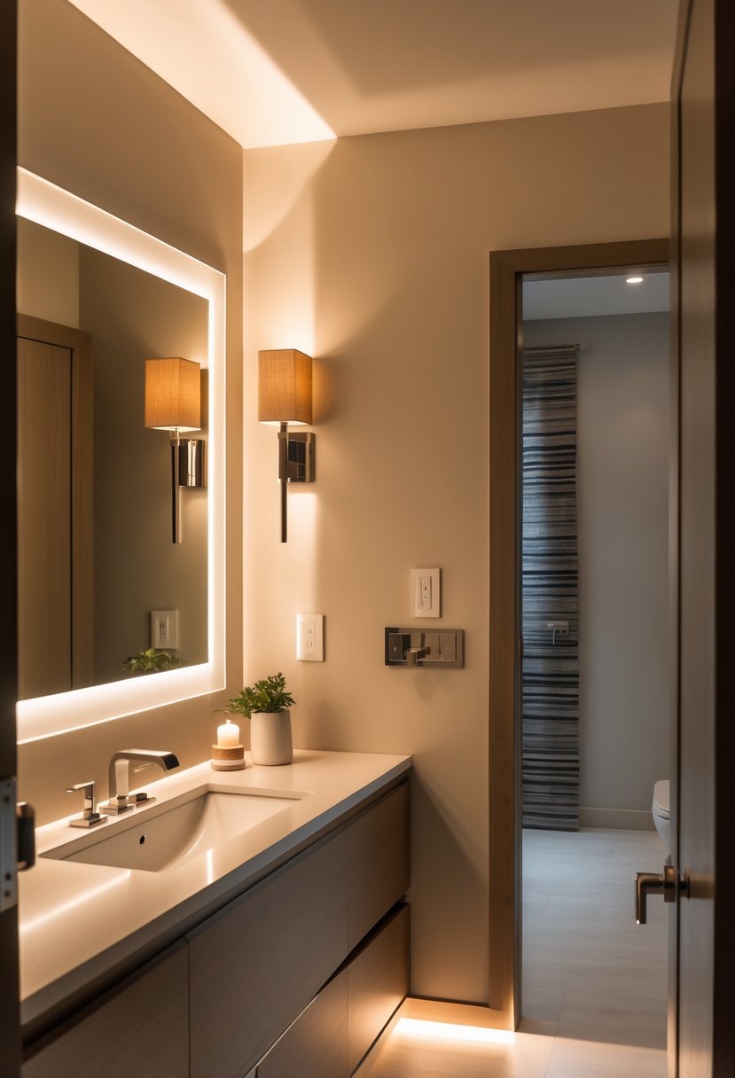 Layered lighting creates a balanced and inviting atmosphere in a guest bathroom. Wall sconces placed beside the mirror offer clear, useful light for grooming tasks.
