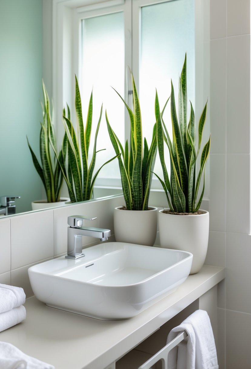 A snake plant works well in guest bathrooms because it needs little light and water. It can handle humidity and low light, common in bathrooms.