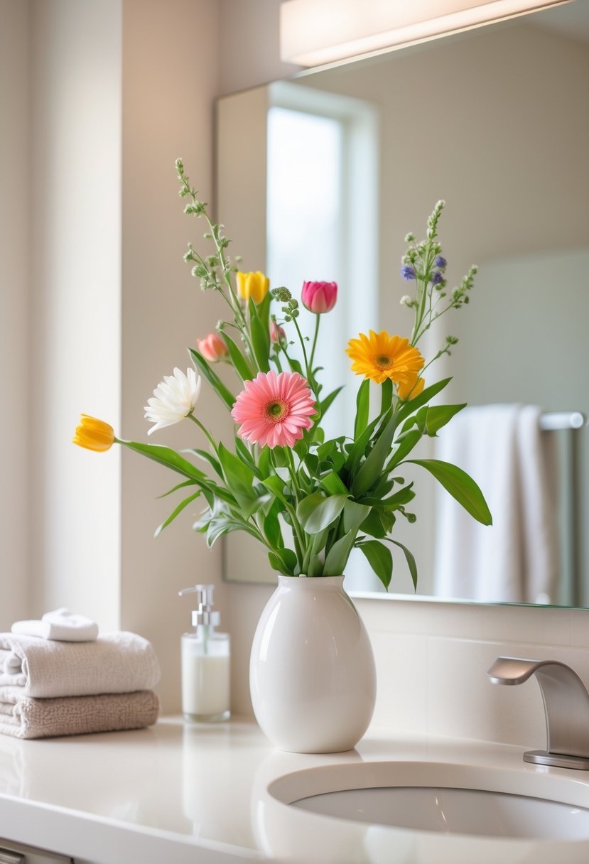 Fresh flowers add color and a natural touch to a guest bathroom. A simple vase with roses or greenery creates a clean and inviting look.