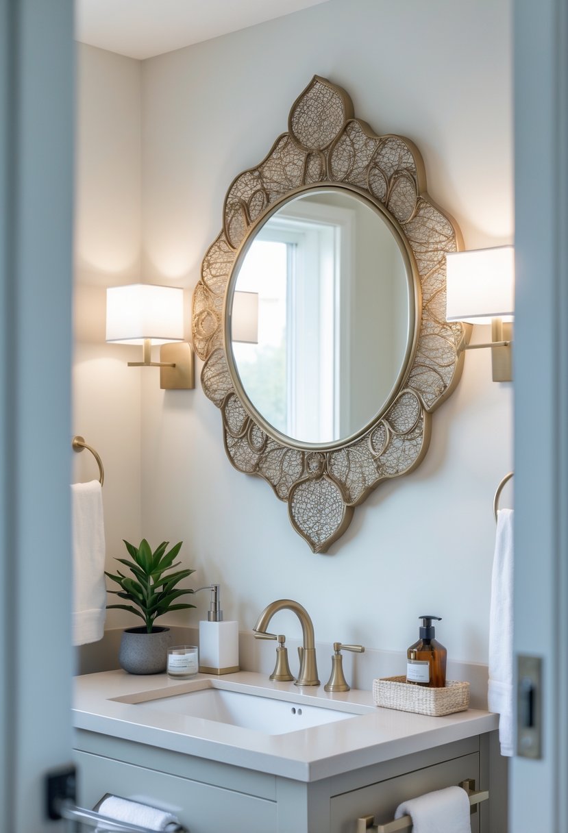 A decorative mirror with a unique frame adds style to any guest bathroom. It creates a clear focal point that draws attention.