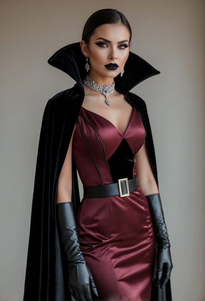 The Glampire outfit blends vampire style with a touch of glamour. It often includes dark clothing with sparkly or satin accessories. Common additions are black gloves, layered wigs, and capes fastened with pins.