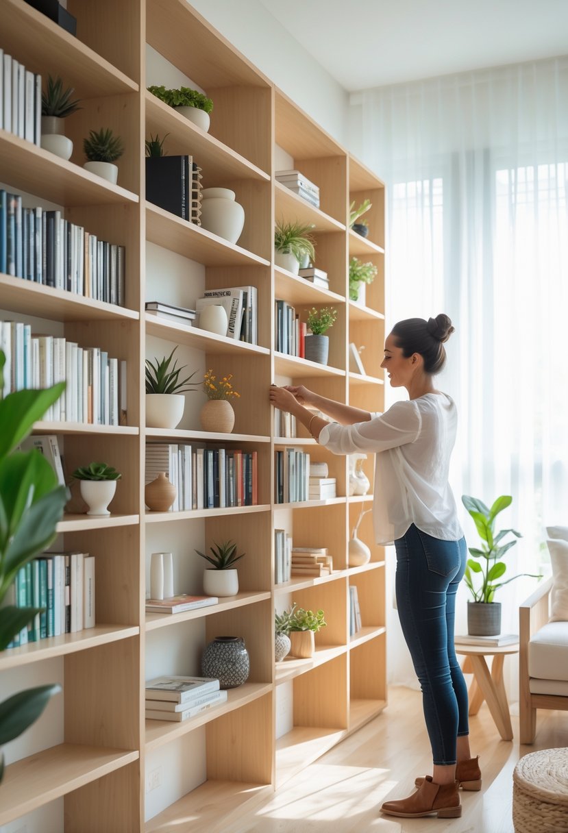 I like to add small plants or greenery to soften the look of bookshelves. They bring color and texture without overwhelming the space. Succulents, air plants, or small potted ferns work well because they need little care and don’t take up much room.