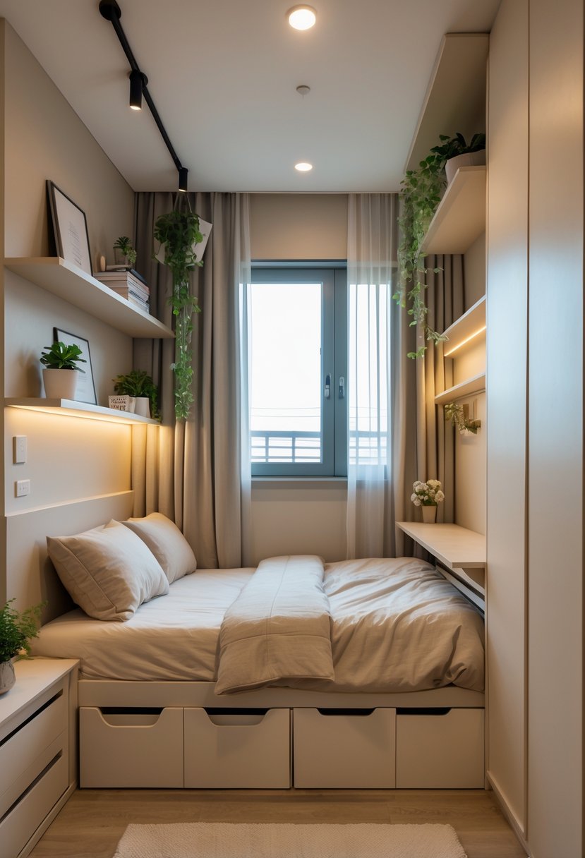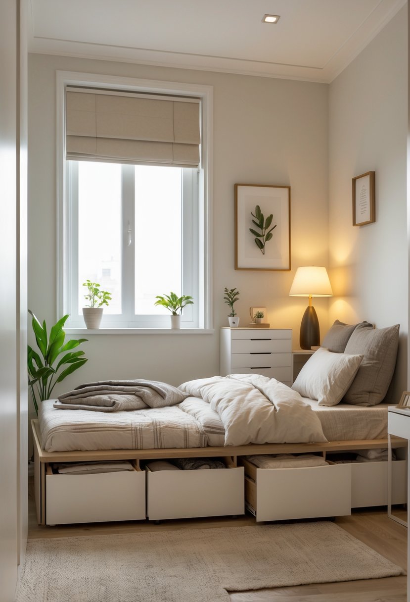 Furniture that serves more than one purpose is key in a small bedroom. Beds with built-in drawers or storage underneath save space. Fold-out desks or nightstands with shelves add function without taking up extra room.