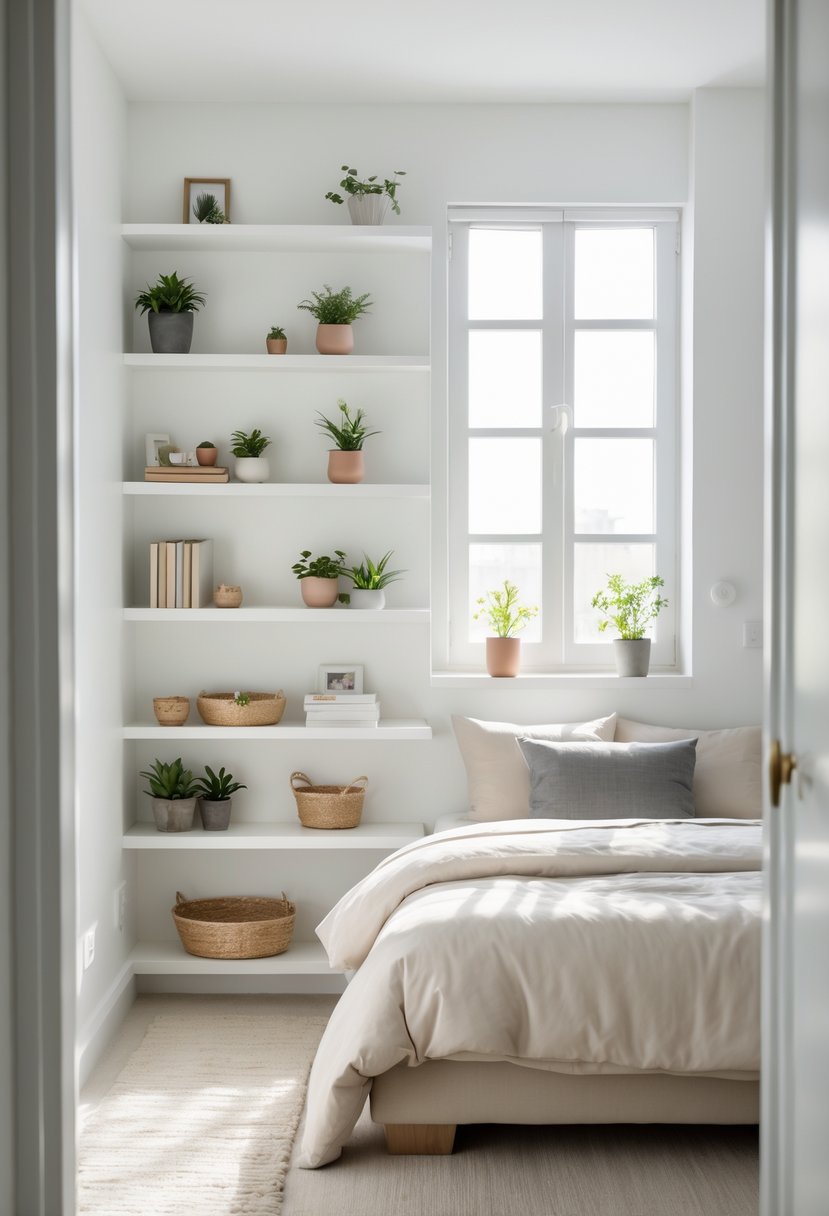 Shelves mounted on walls keep the room feeling open. They also let couples display personal items without adding bulky furniture.