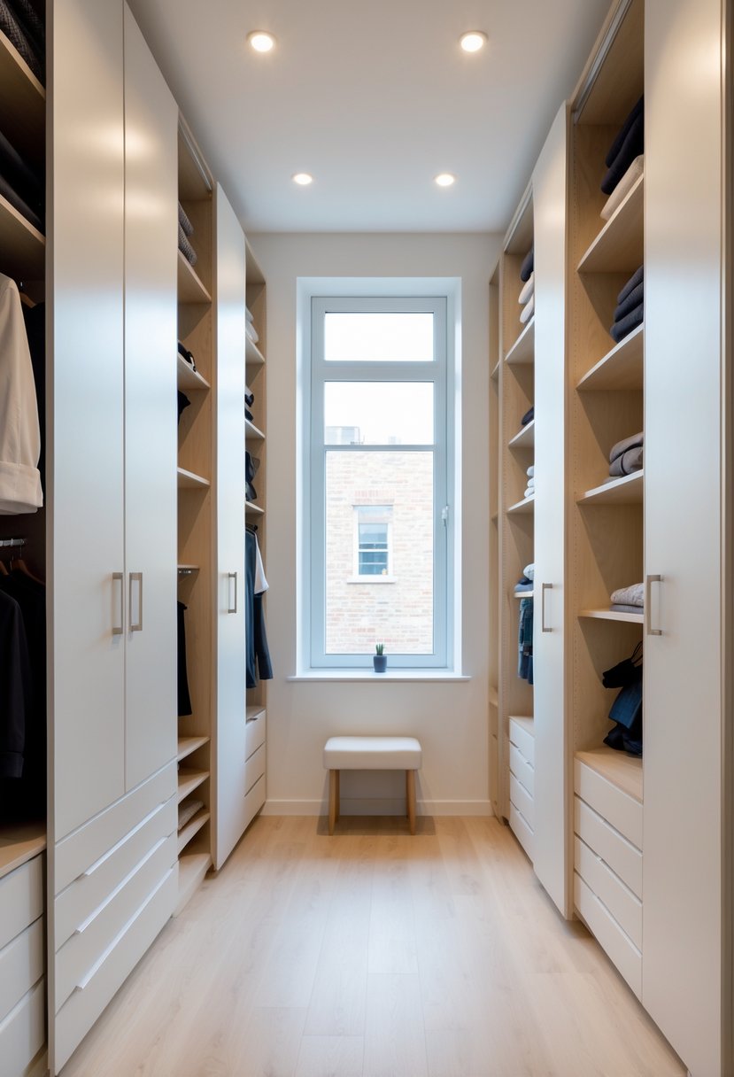 Built-in drawers offer a neat way to store folded clothes in a small dressing room. They keep items organized and easy to find without taking up extra space.