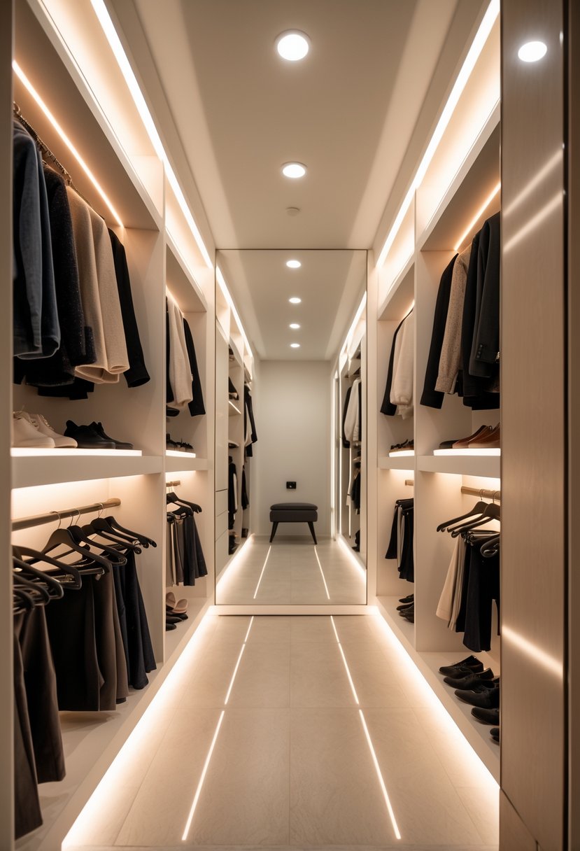 LED strip lights installed under shelves provide better visibility for clothes and accessories. They help reduce shadows, making it easier to find items quickly.