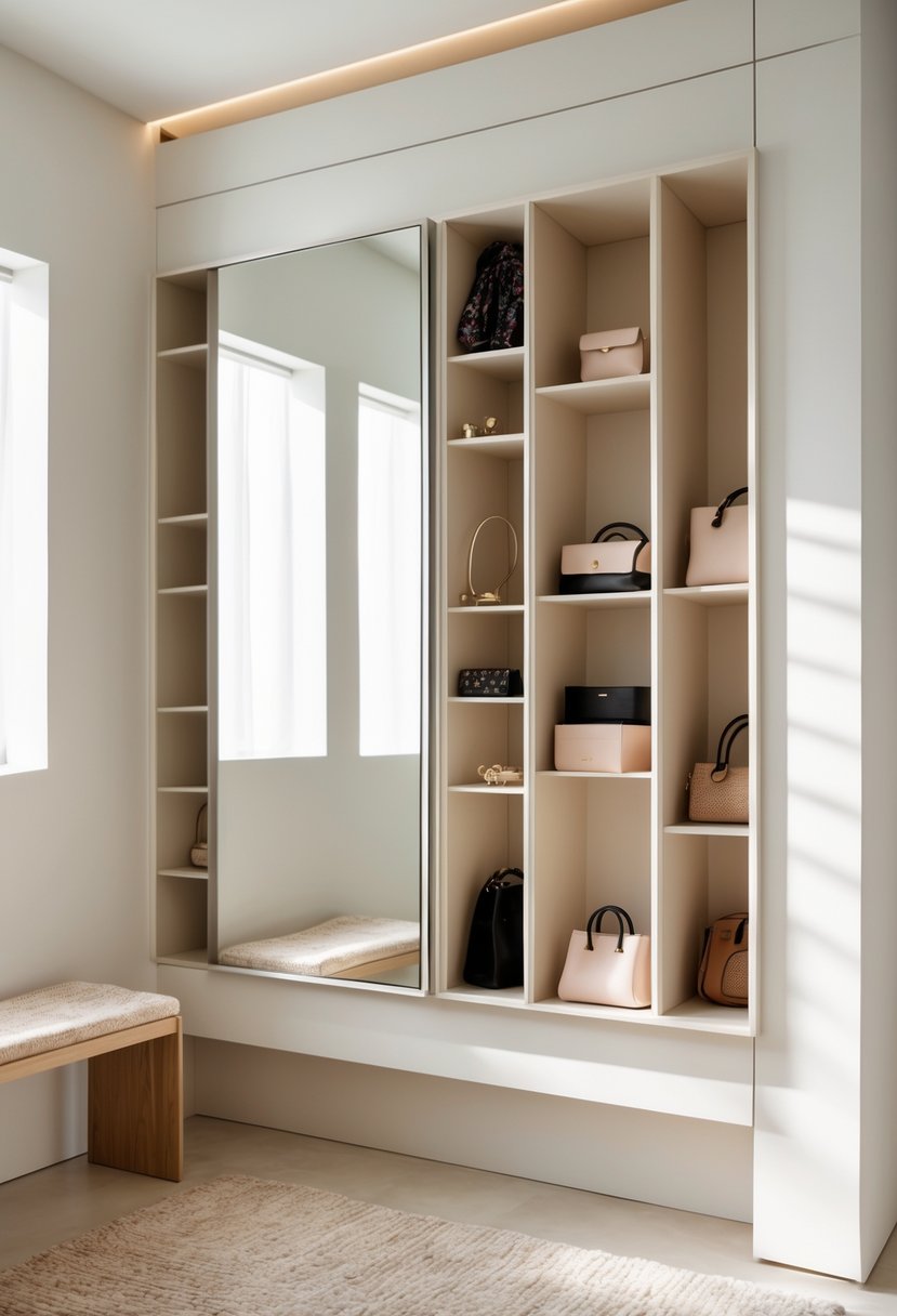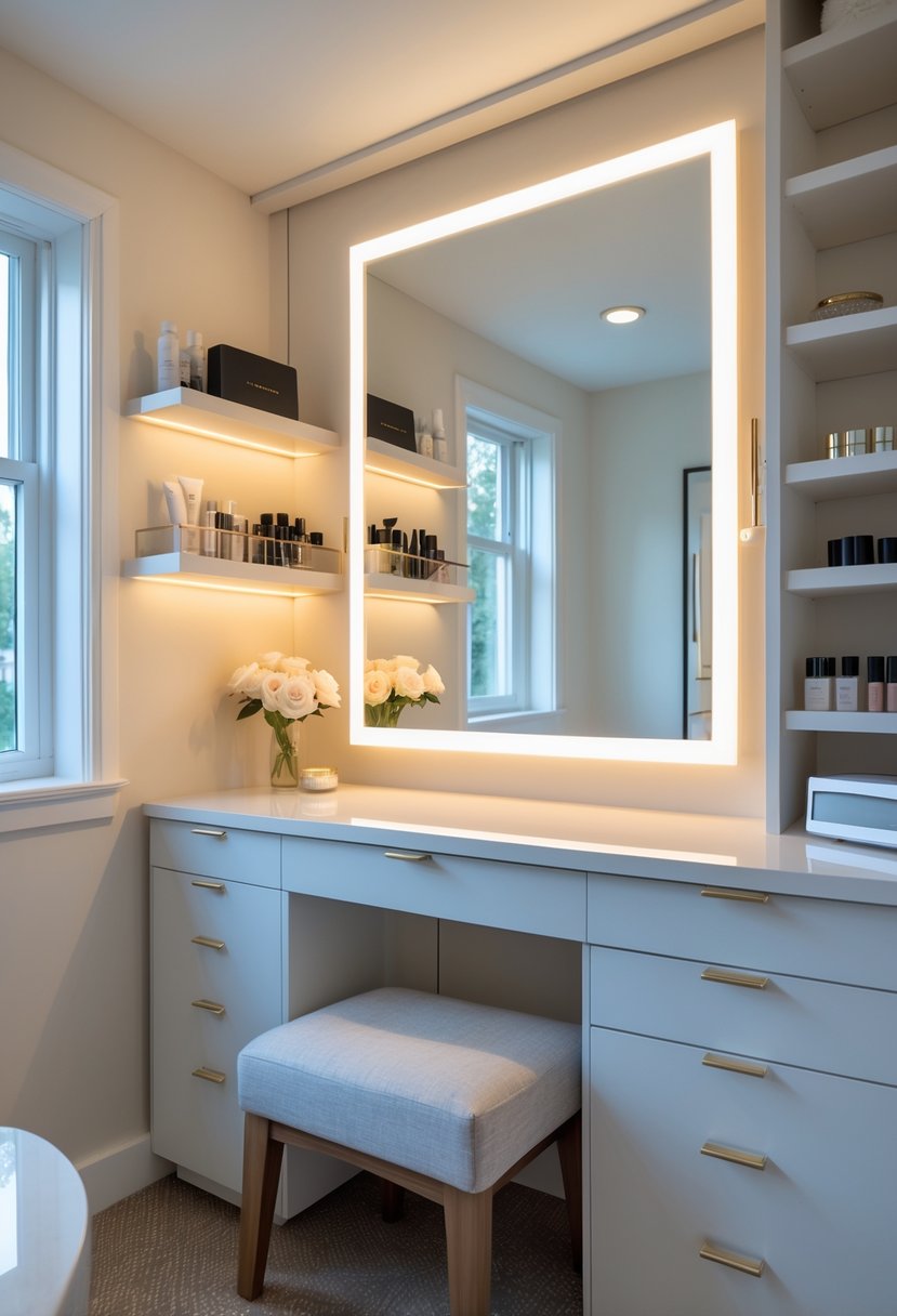 Hidden storage behind or around the mirror keeps the dressing room tidy and saves floor space. This makes the area more organized without adding clutter.