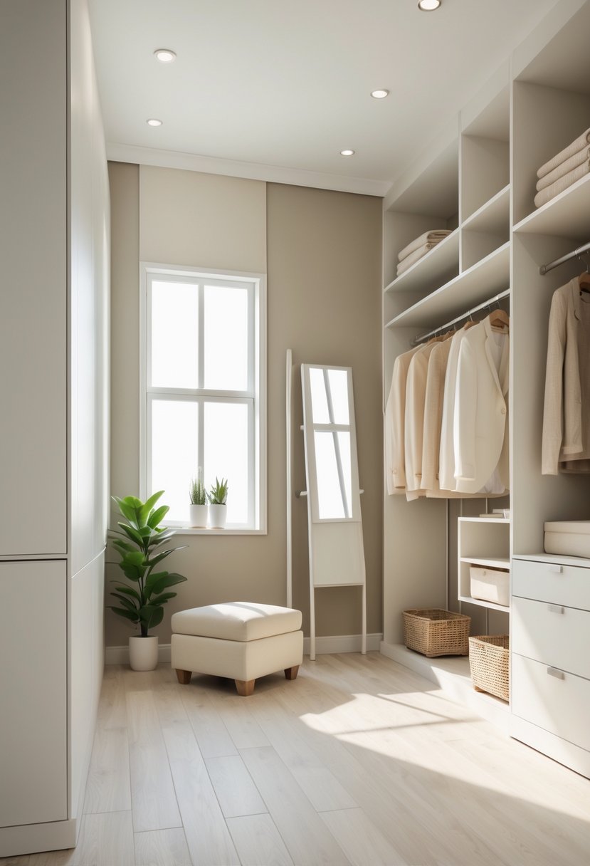 Neutral colors like white, beige, and soft grays help reflect natural and artificial light. This makes the dressing room feel more open and airy.