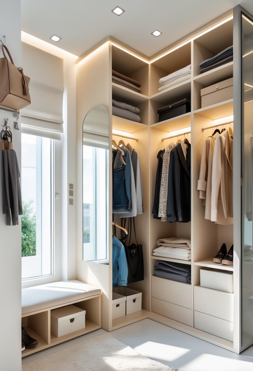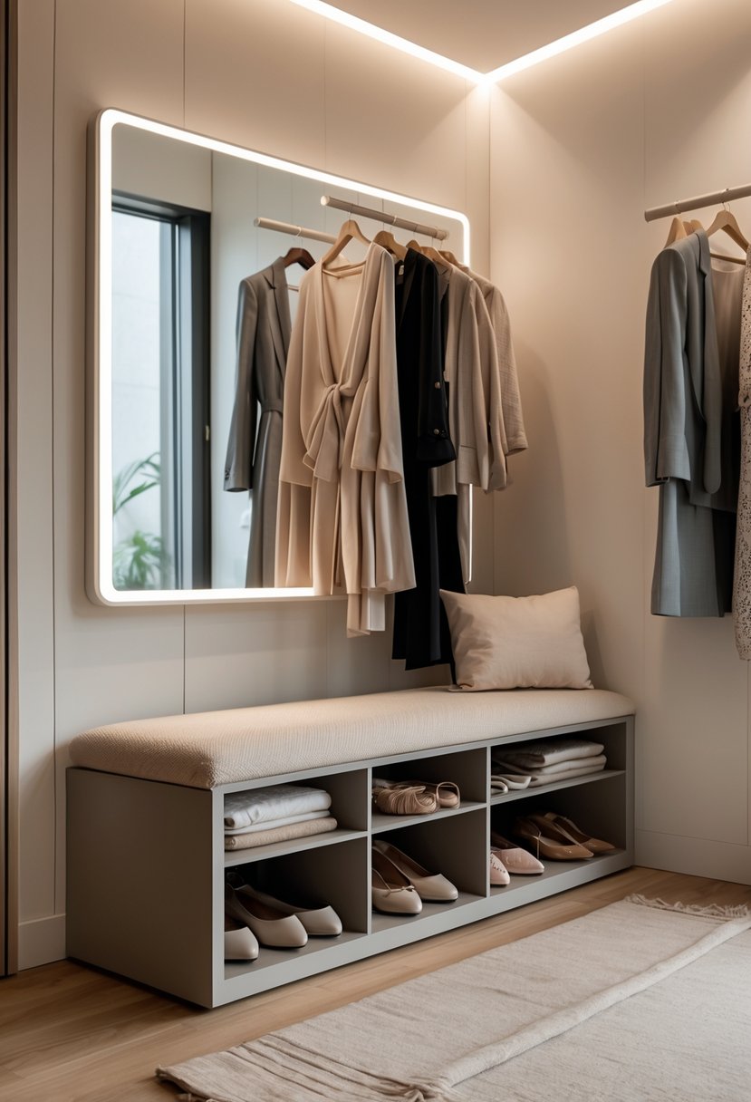 A bench with storage underneath adds both seating and organization to a small dressing room. It offers a place to sit while getting ready or trying on shoes.