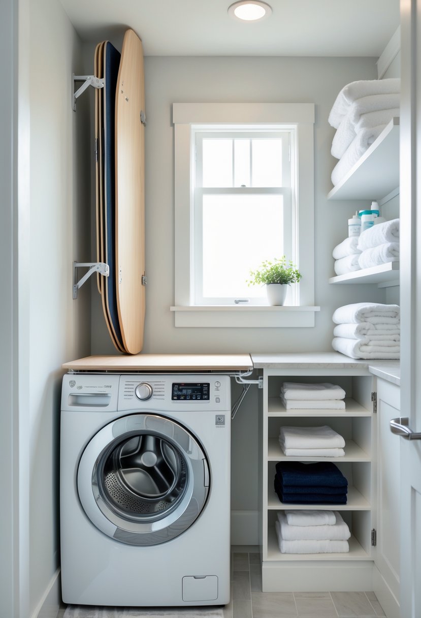 A fold-down ironing board saves space by folding flat against the wall when not in use. It is easy to set up and put away, making it practical for small laundry rooms.